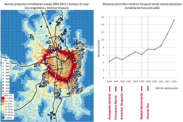 De hecho, dada nuestra débil regulación, estos desarrollos inmobiliarios se construyen cada vez más lejos. Un estudio en curso muestra que las distancias entre los nuevos proyectos y la ciudad consolidada (representada por la circunvalación Américo Vespucio) se han triplicado entre el año 2004 y el 2014, como se puede ver en la figura 2. La accesibilidad (en auto) que otorgan las autopistas es uno de los principales atractores para este desarrollo inmobiliario, que además es fuertemente segregado en términos socioeconómicos (ver Cox y Hurtubia, 2016).