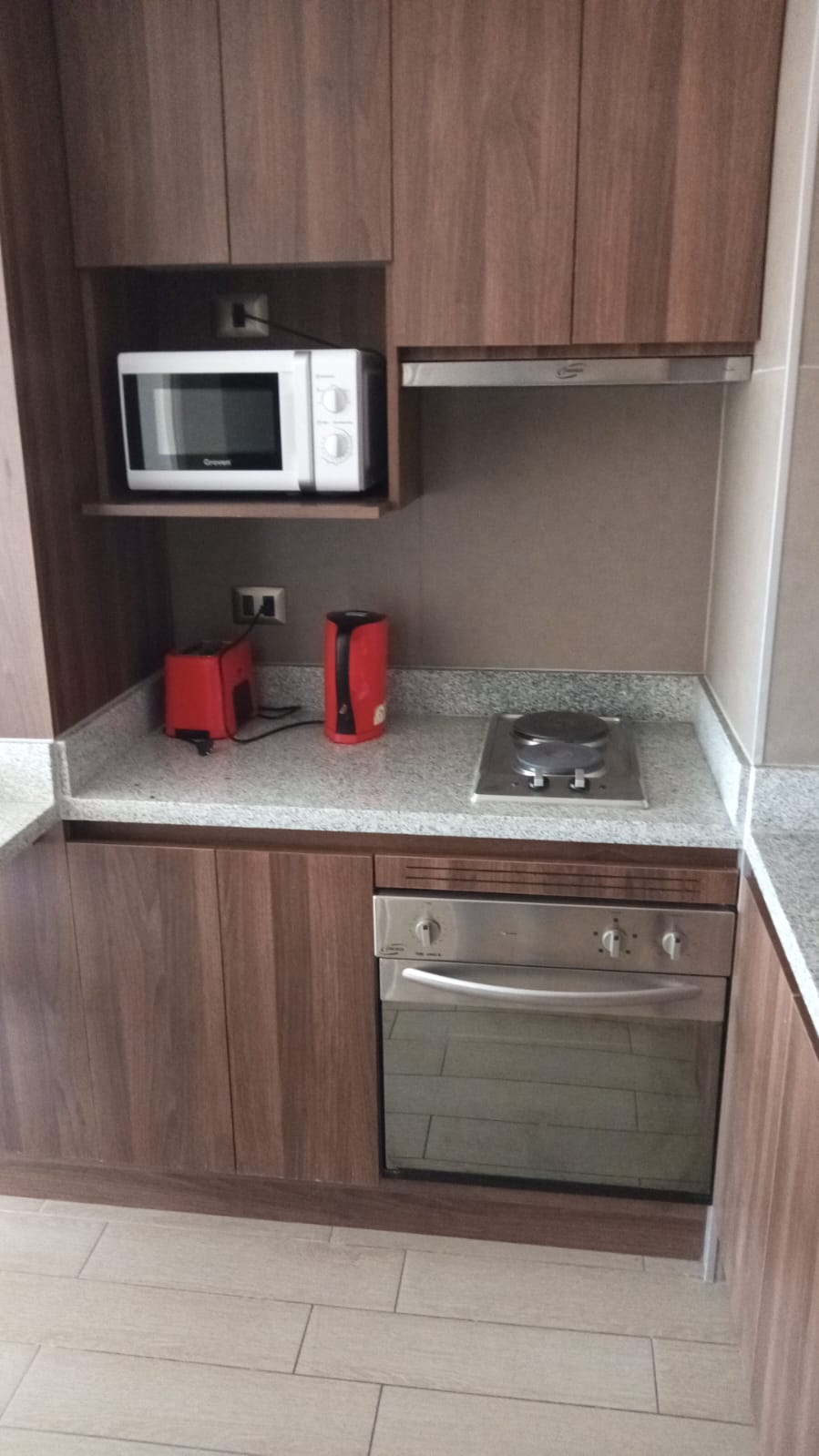 - Cocina tipo americana amoblada y equipada con cocina encimera, horno y campana eléctrica