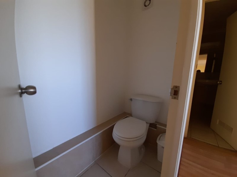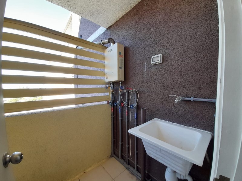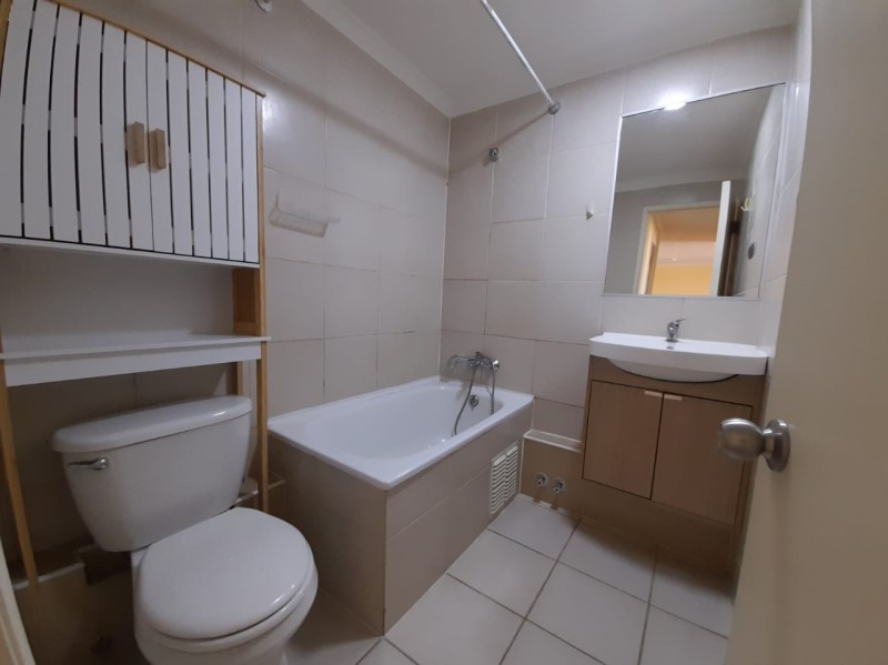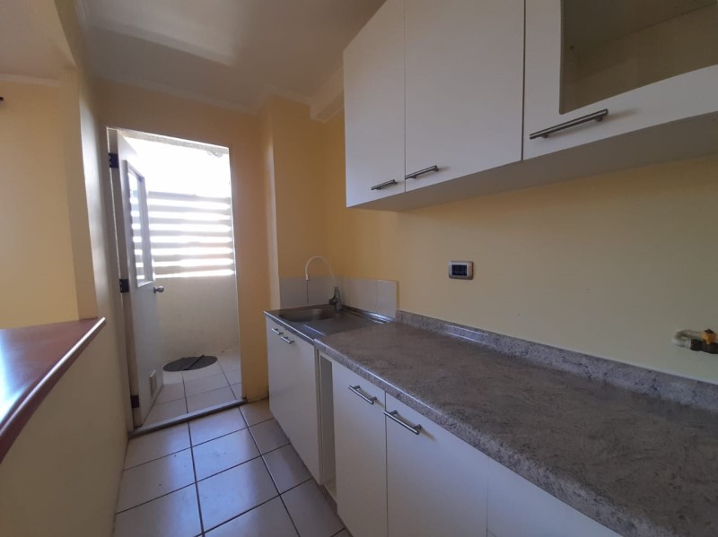 Este departamento se arrienda con lámparas y rieles para cortinas. En tanto, el edificio cuenta con recepción con conserjería las 24 horas, salón de usos múltiples y patio.