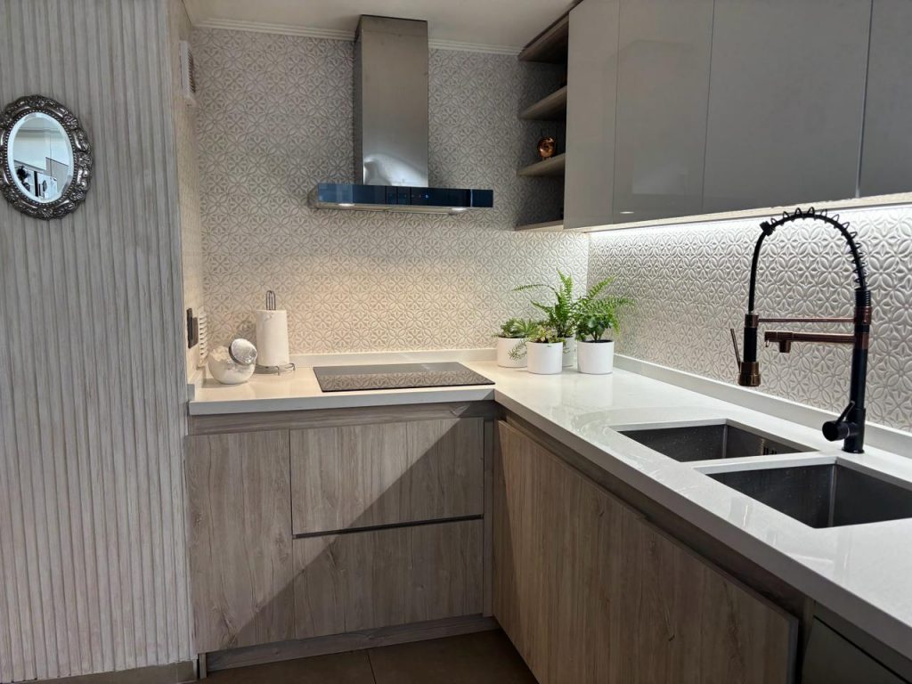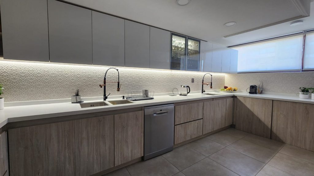 Consta de living comedor , cocina amoblada y equipada concepto abierto ,