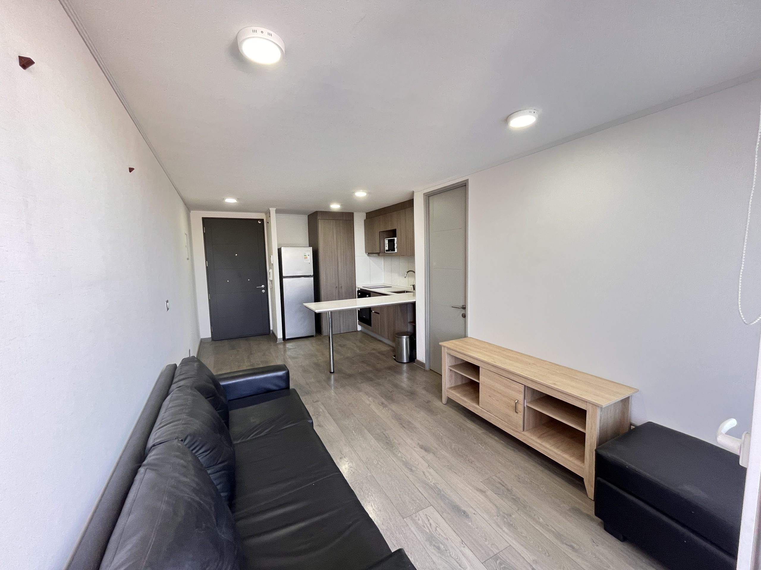 - Cocina americana amoblada y equipada con cocina encimera, horno empotrado y campana extractora
