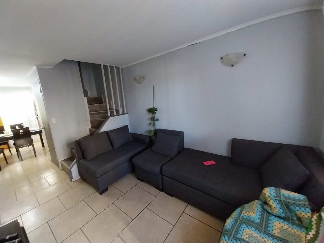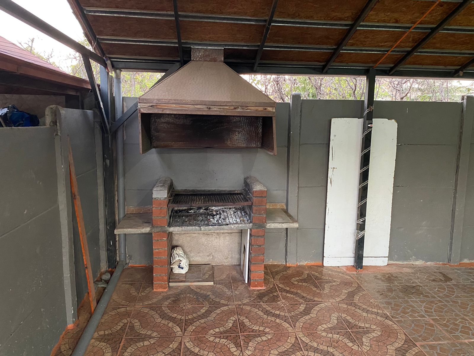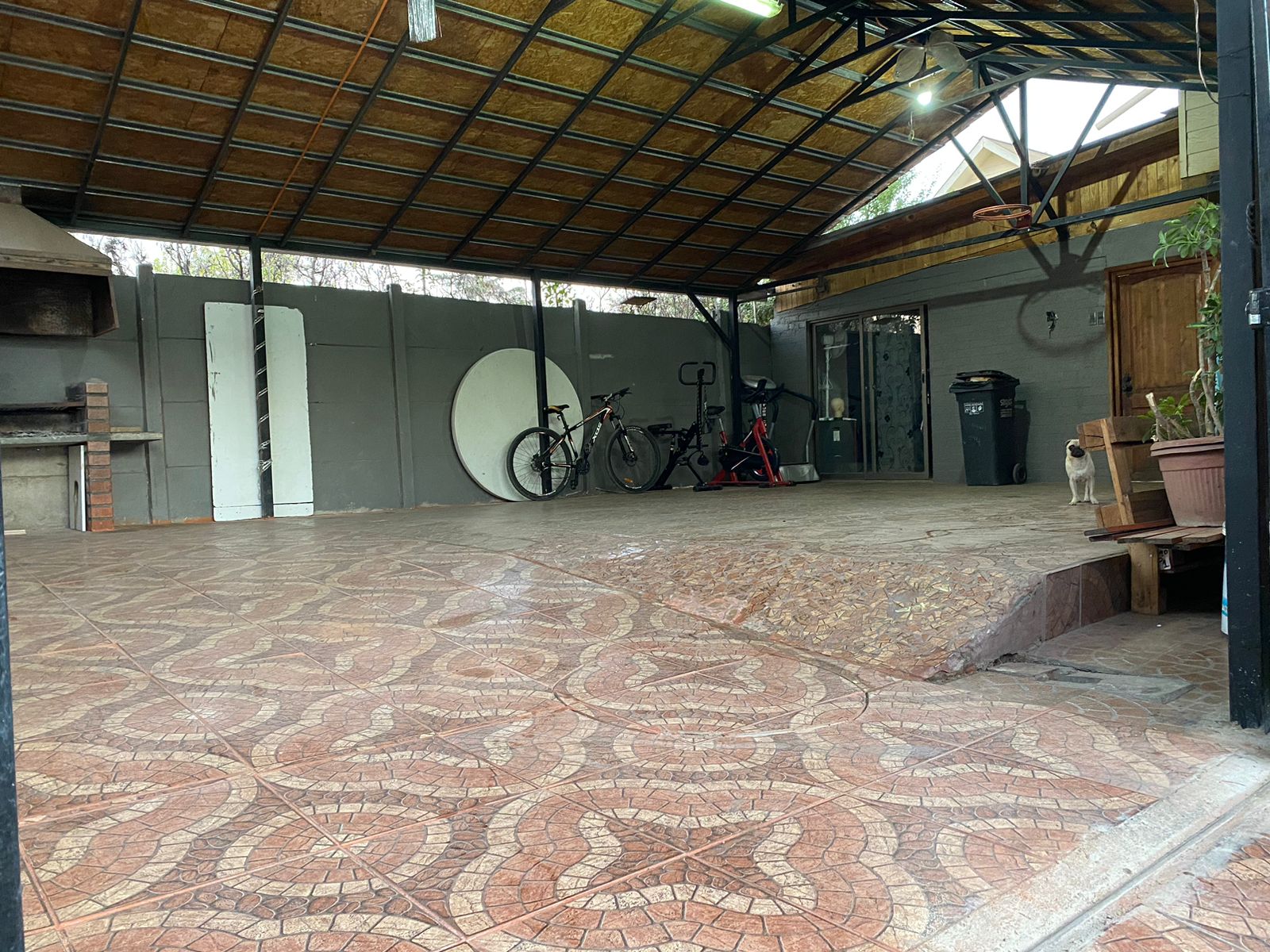 Patio techado con quincho, y espacio para estacionar tres vehículos grandes.