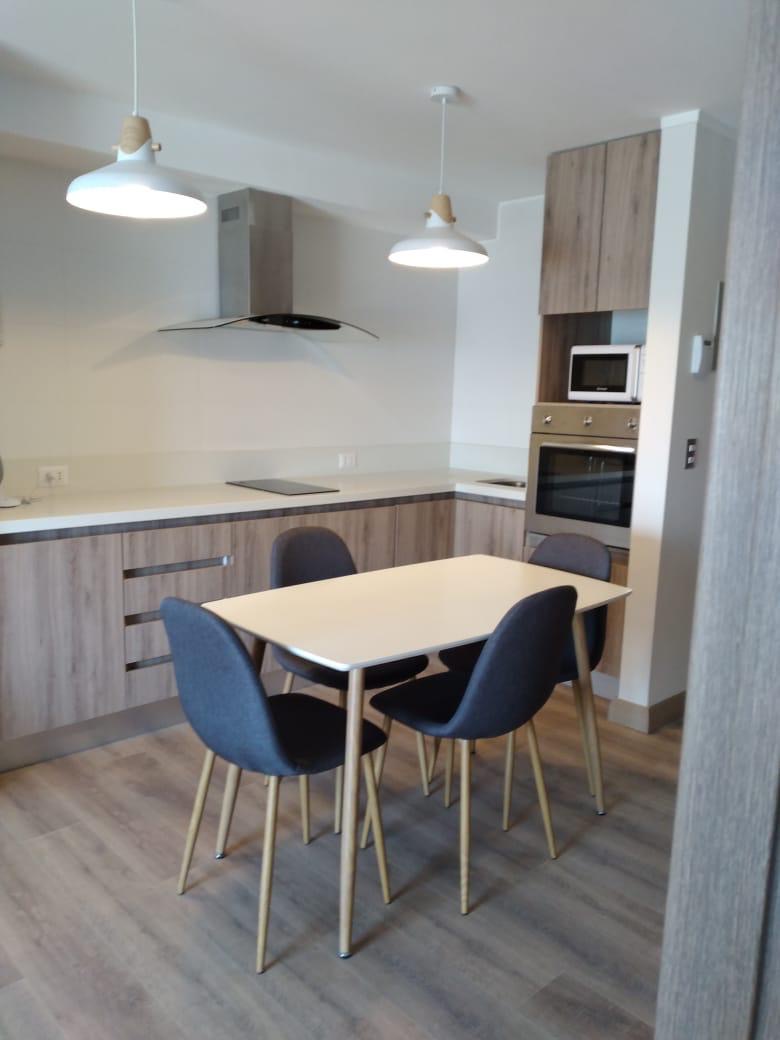 - Cocina americana con horno eléctrico, campana, mesones de granito, mesa de comedor para 4 personas, clóset para útiles de aseo y espacio para ubicar lavadora con conexión.