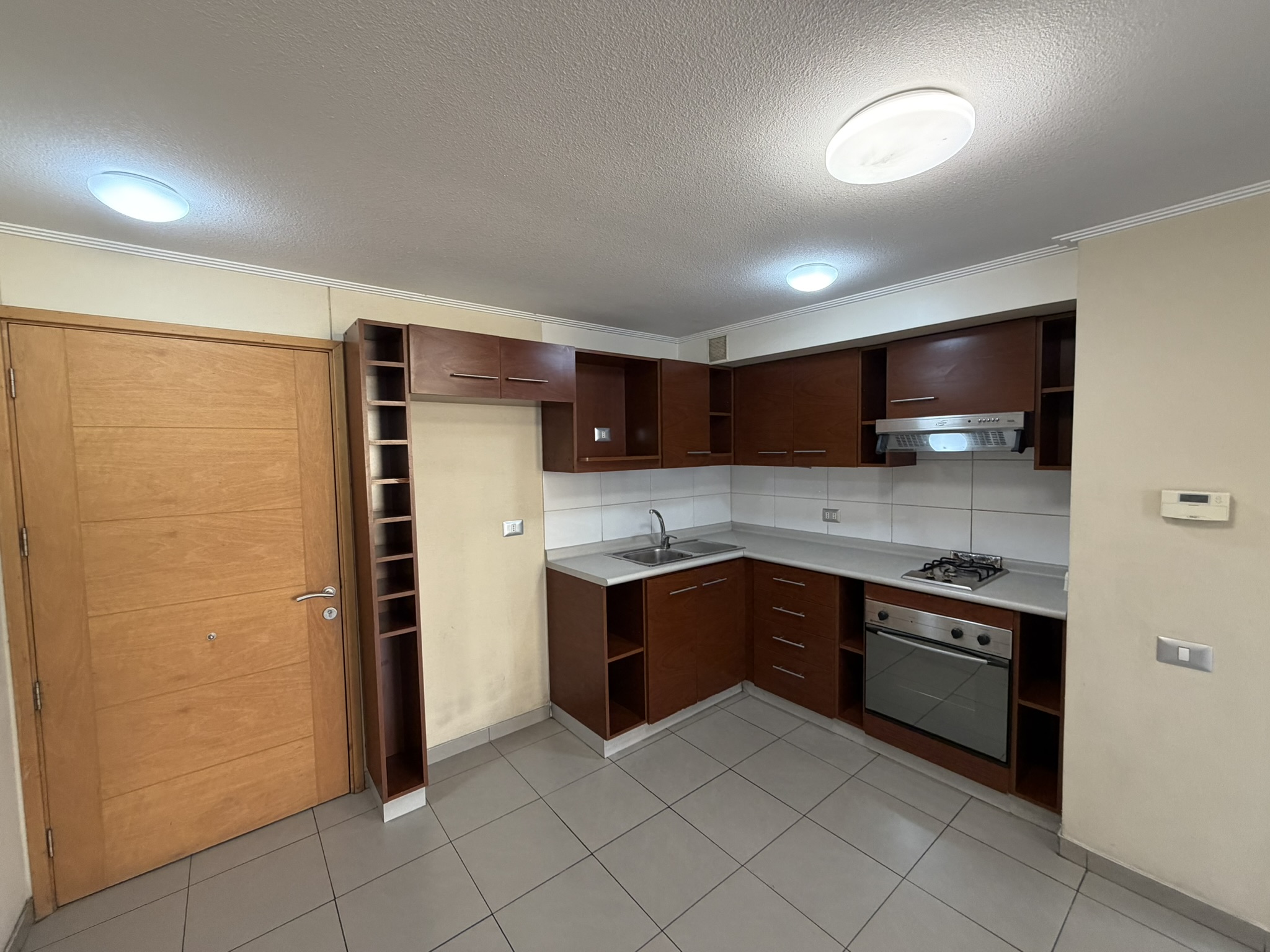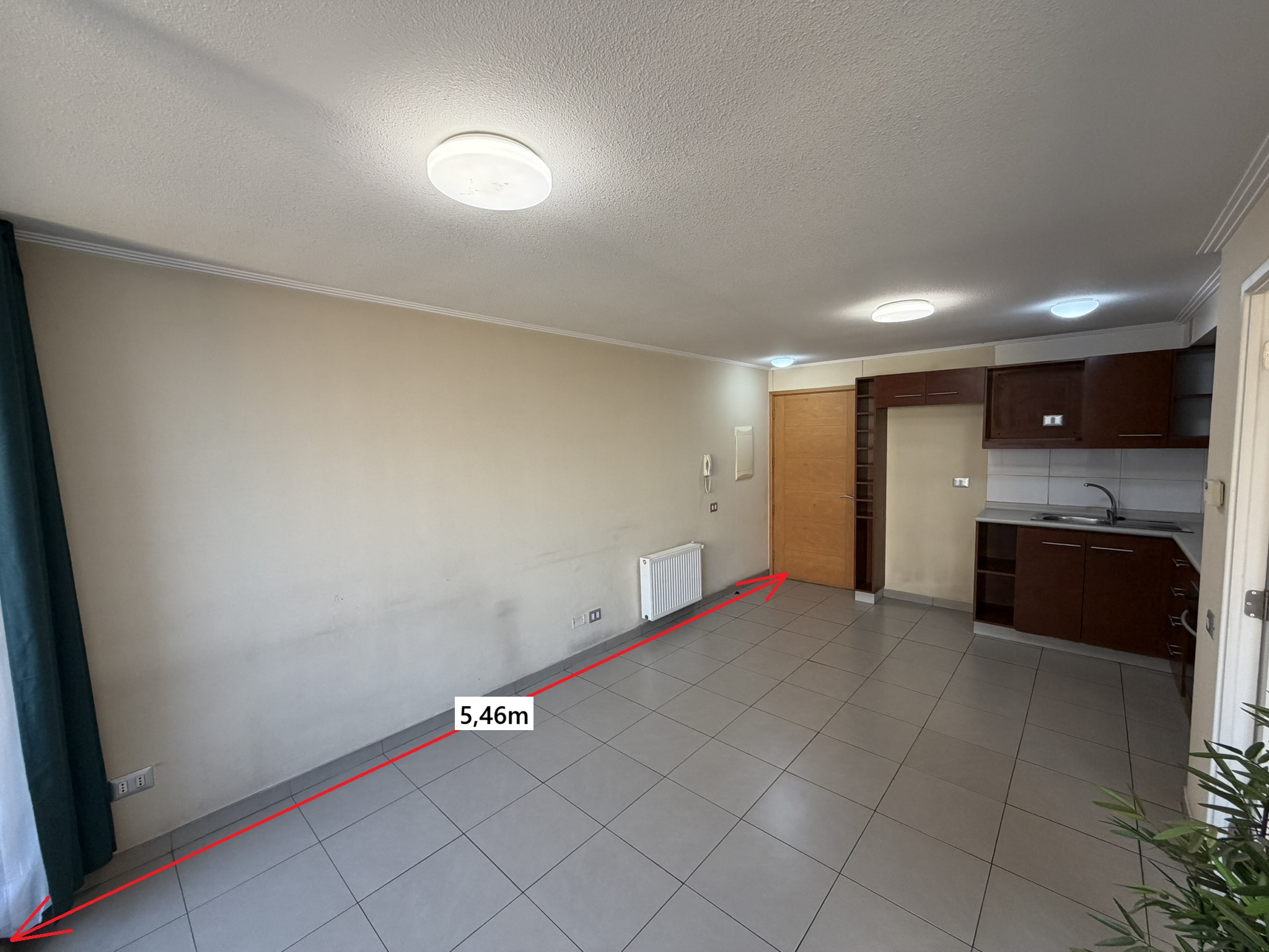 Living y comedor juntos, cocina americana amoblada y equipada con encimera a gas, horno y campana eléctrica. Dormitorio con dos closets, un baño con tina y balcón de 3m2.