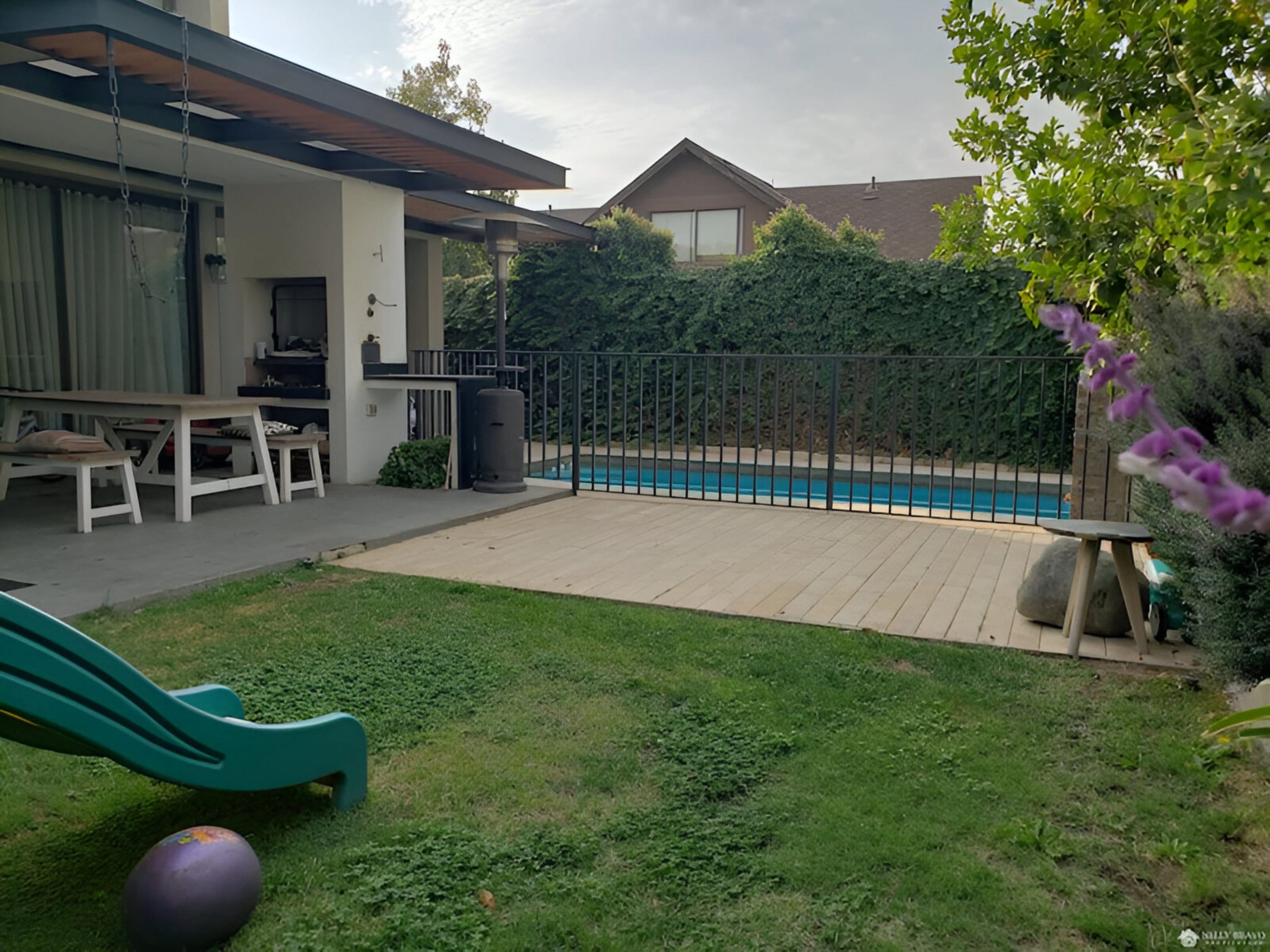 Piscina con reja perimetral y cascada incorporada.