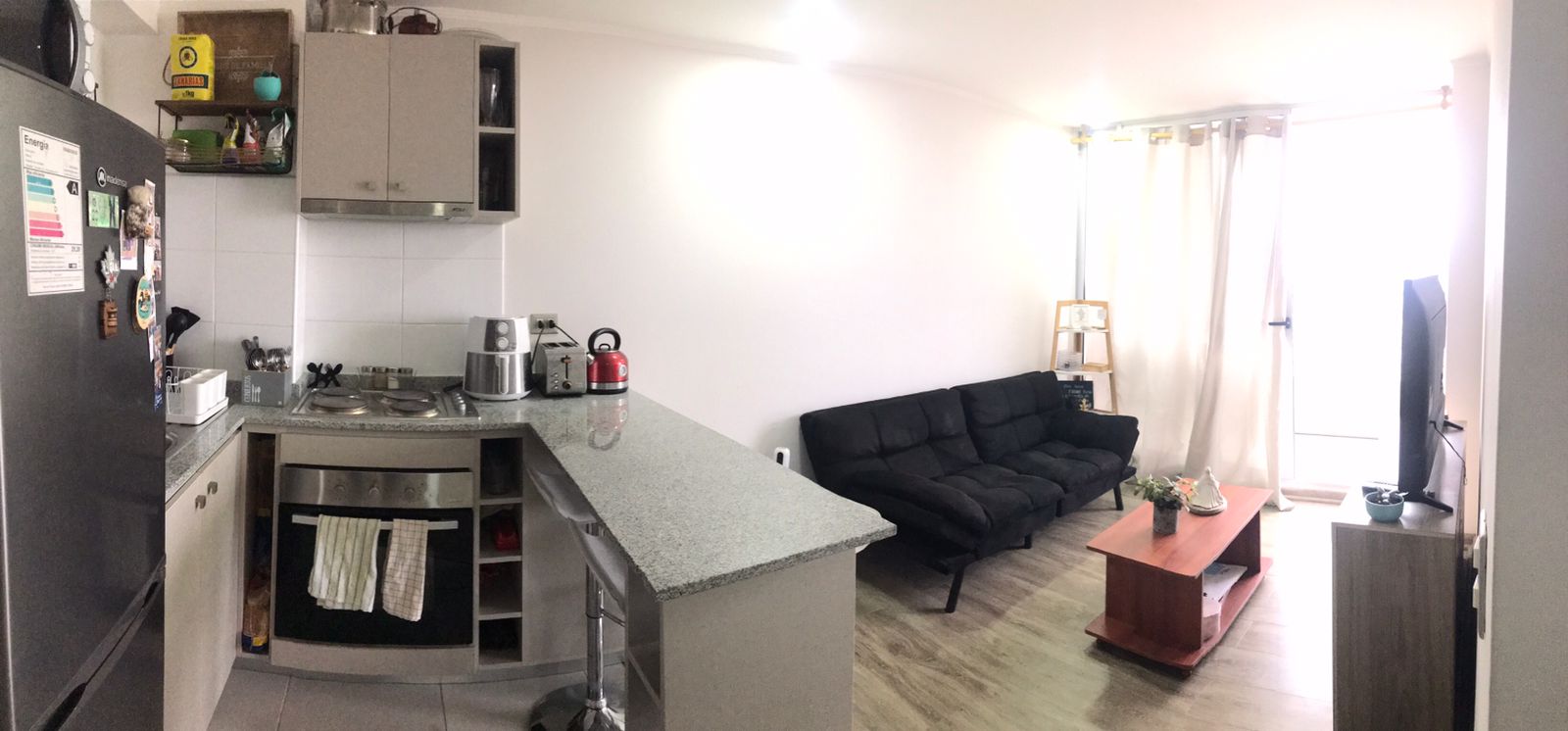 Living-comedor, terraza, 2 dormitorios, 1 baño, cocina americana amoblada, equipada con encimera, horno eléctrico y campana