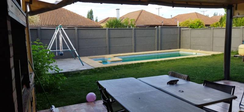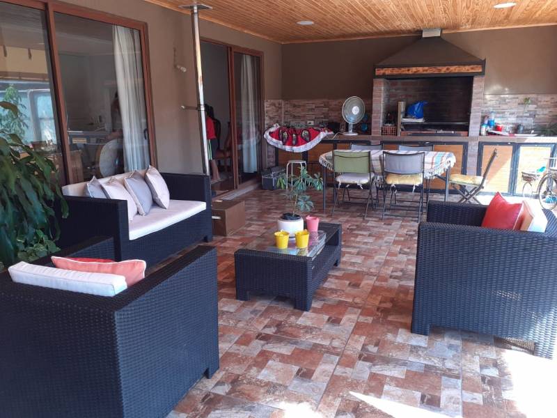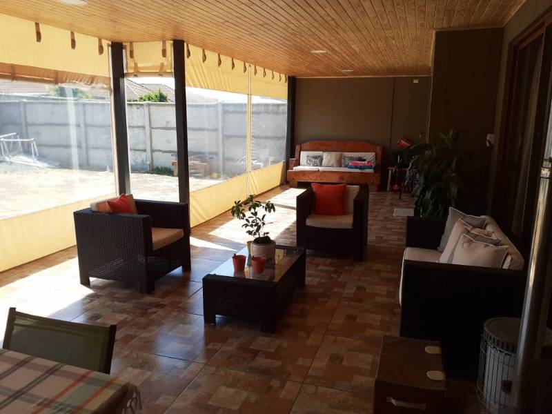 La propiedad cuenta con terraza techada y cerrada con cortina de PVC hermética enrollable, quincho, pasillo lateral cerrado y techado, garage de 30 m2 para dos vehículos, patio y ante jardín.