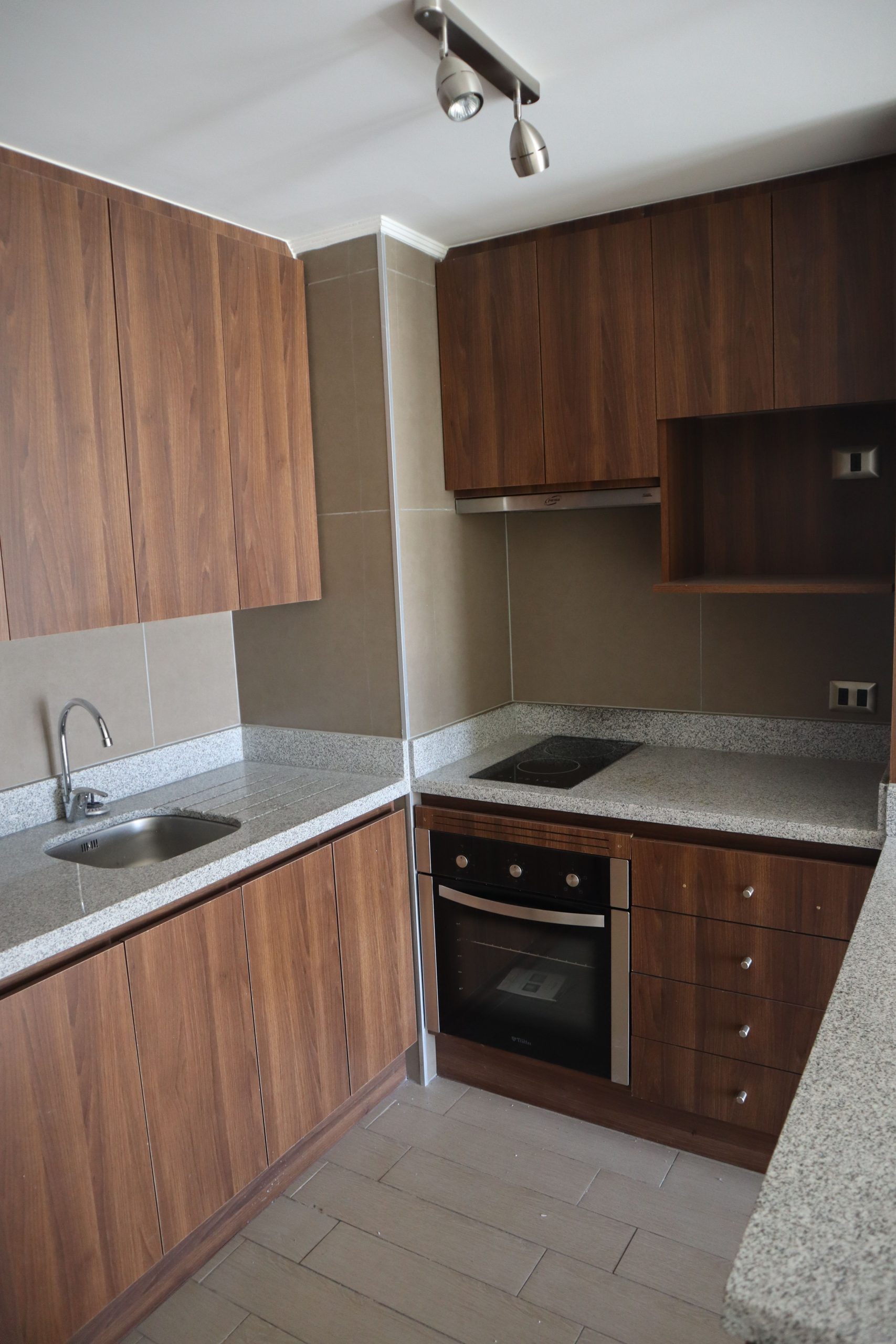 - Cocina tipo americana amoblada y equipada con cocina encimera, horno y campana eléctrica