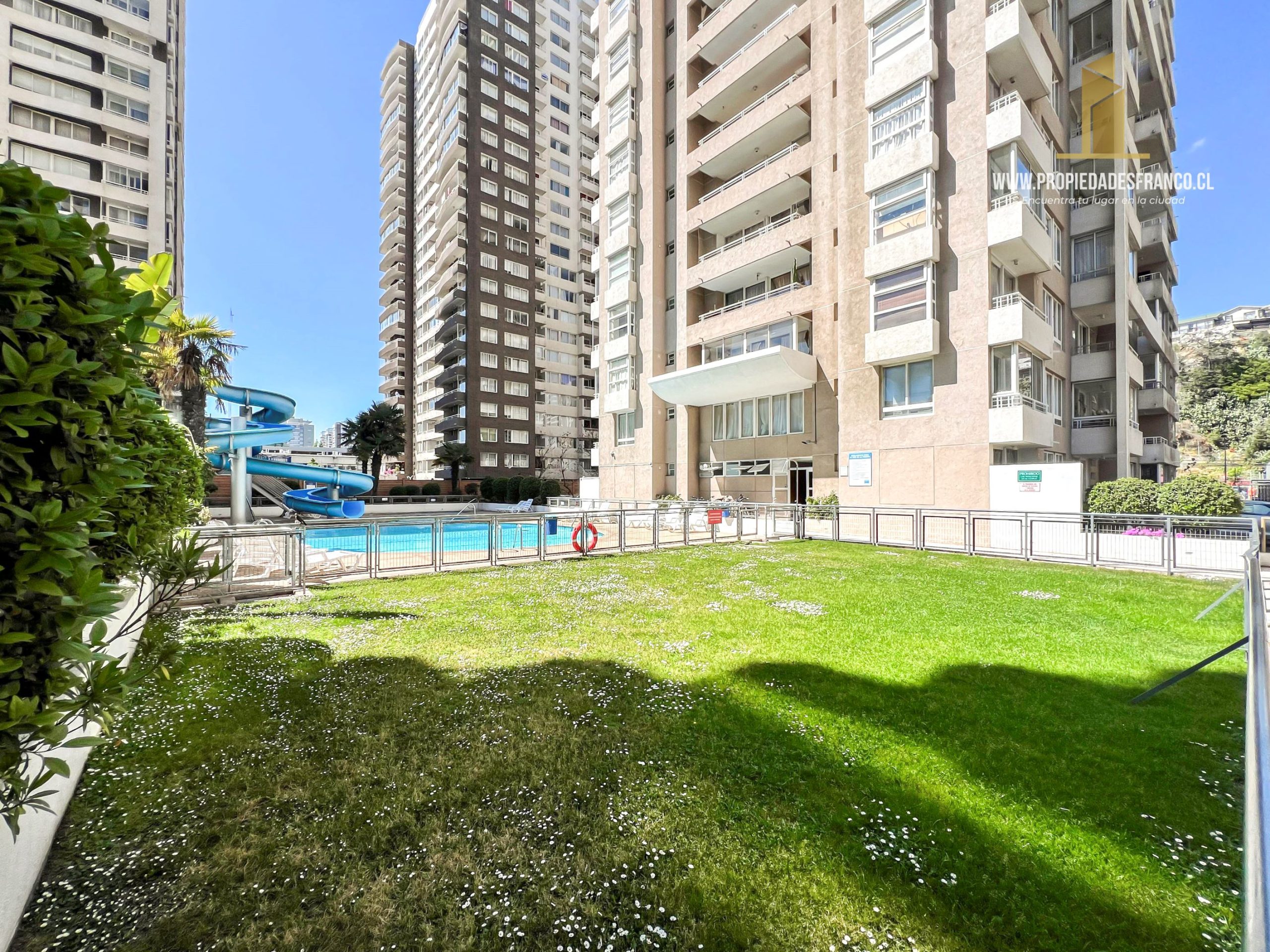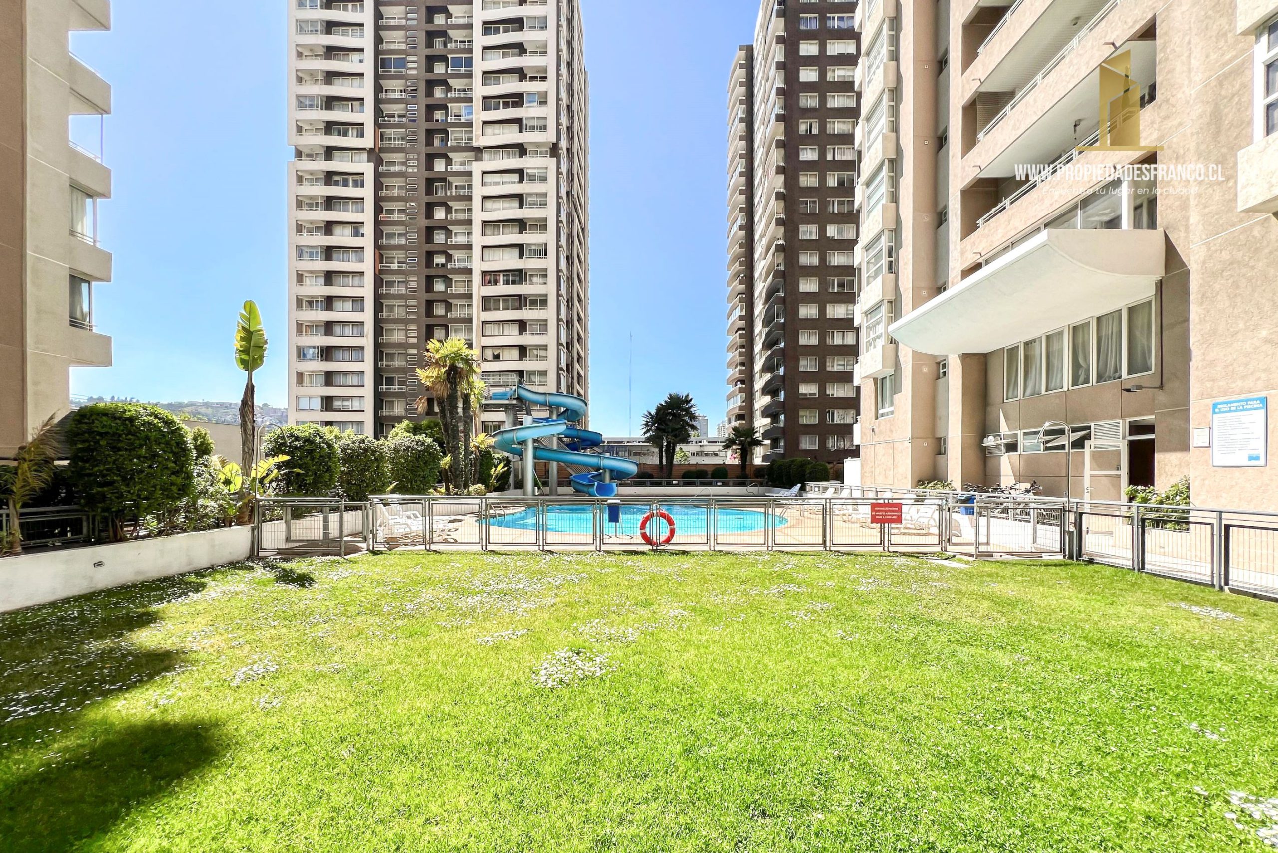 Areas verdes con piscina y toboganes
