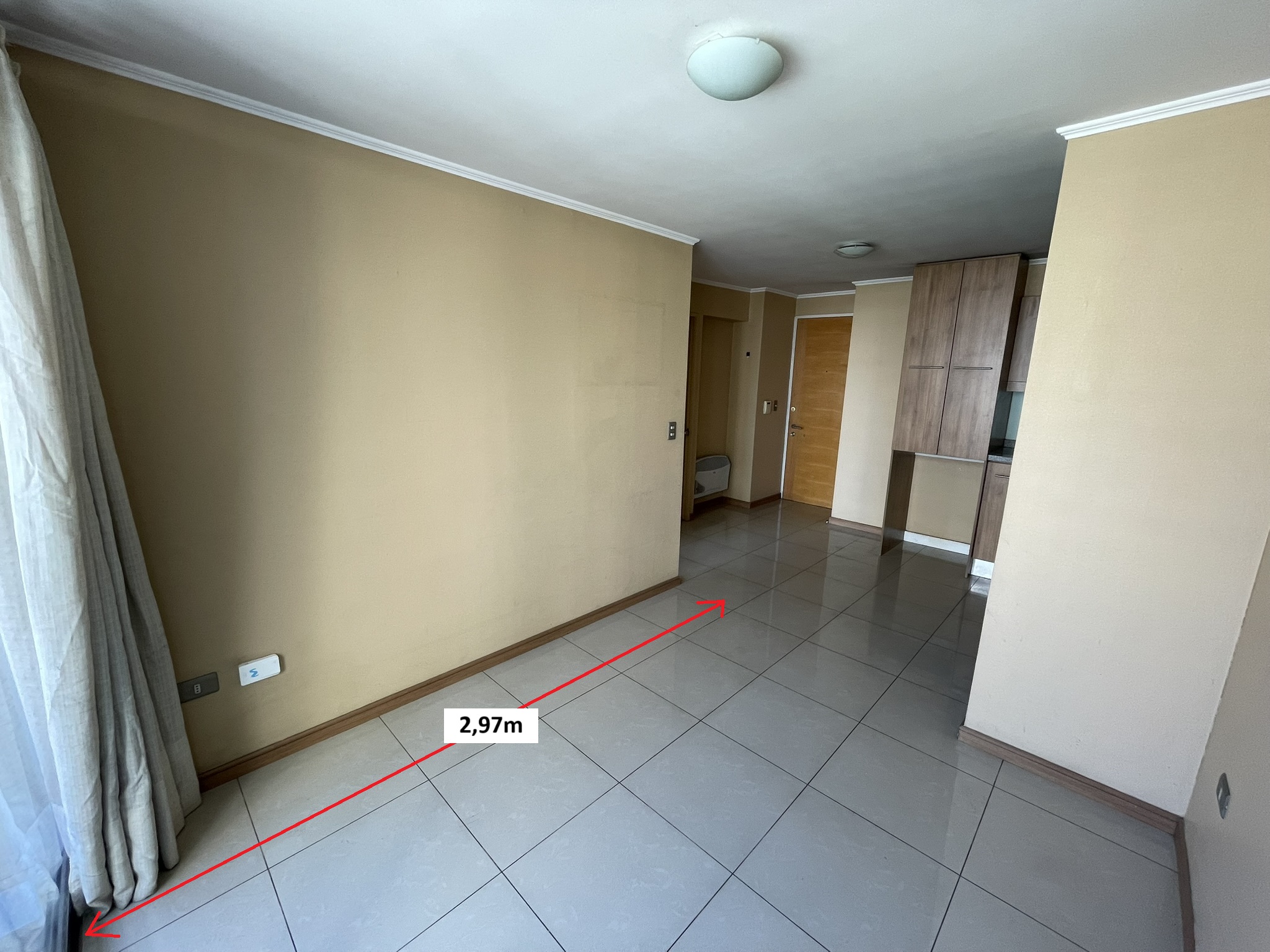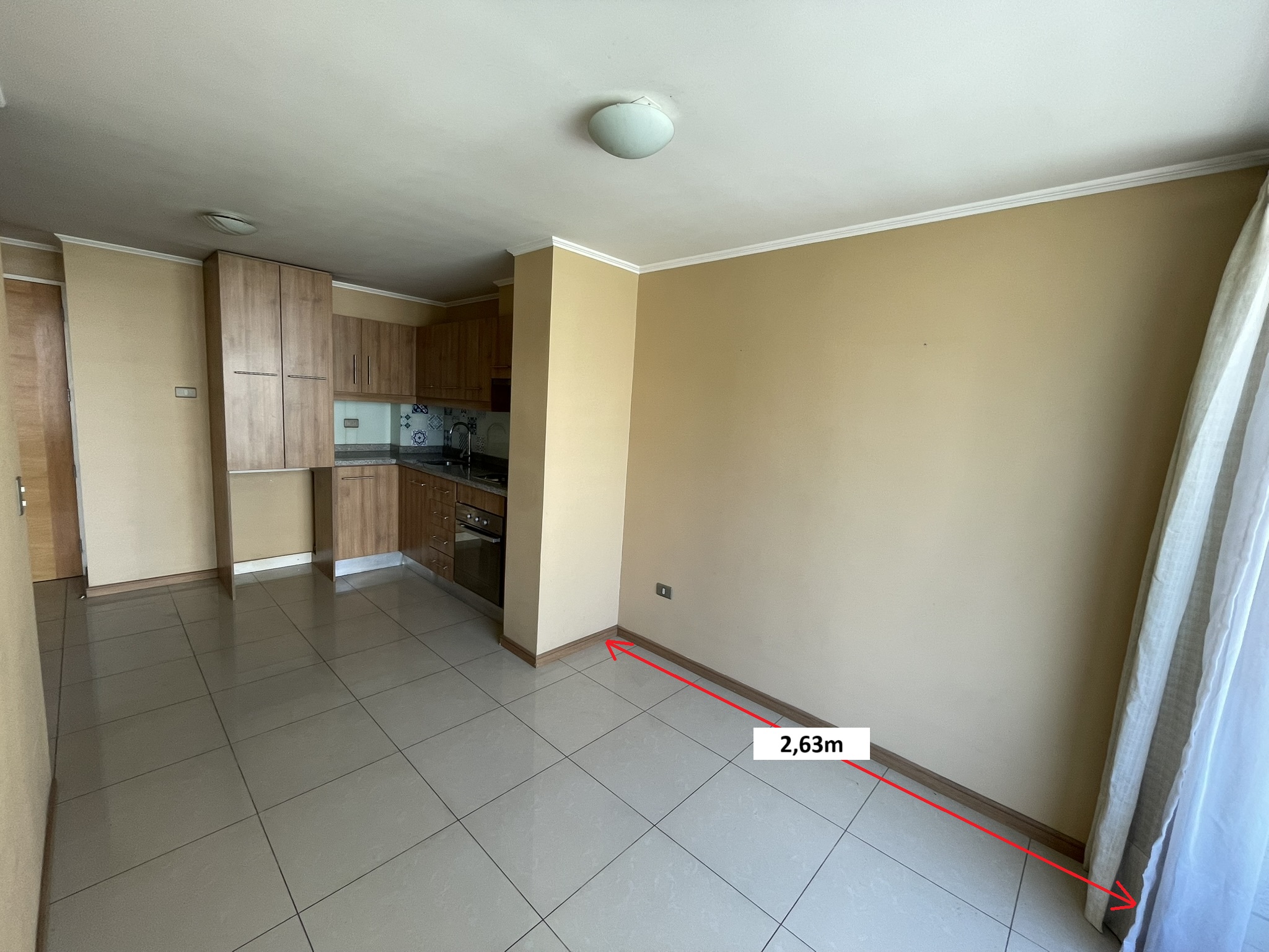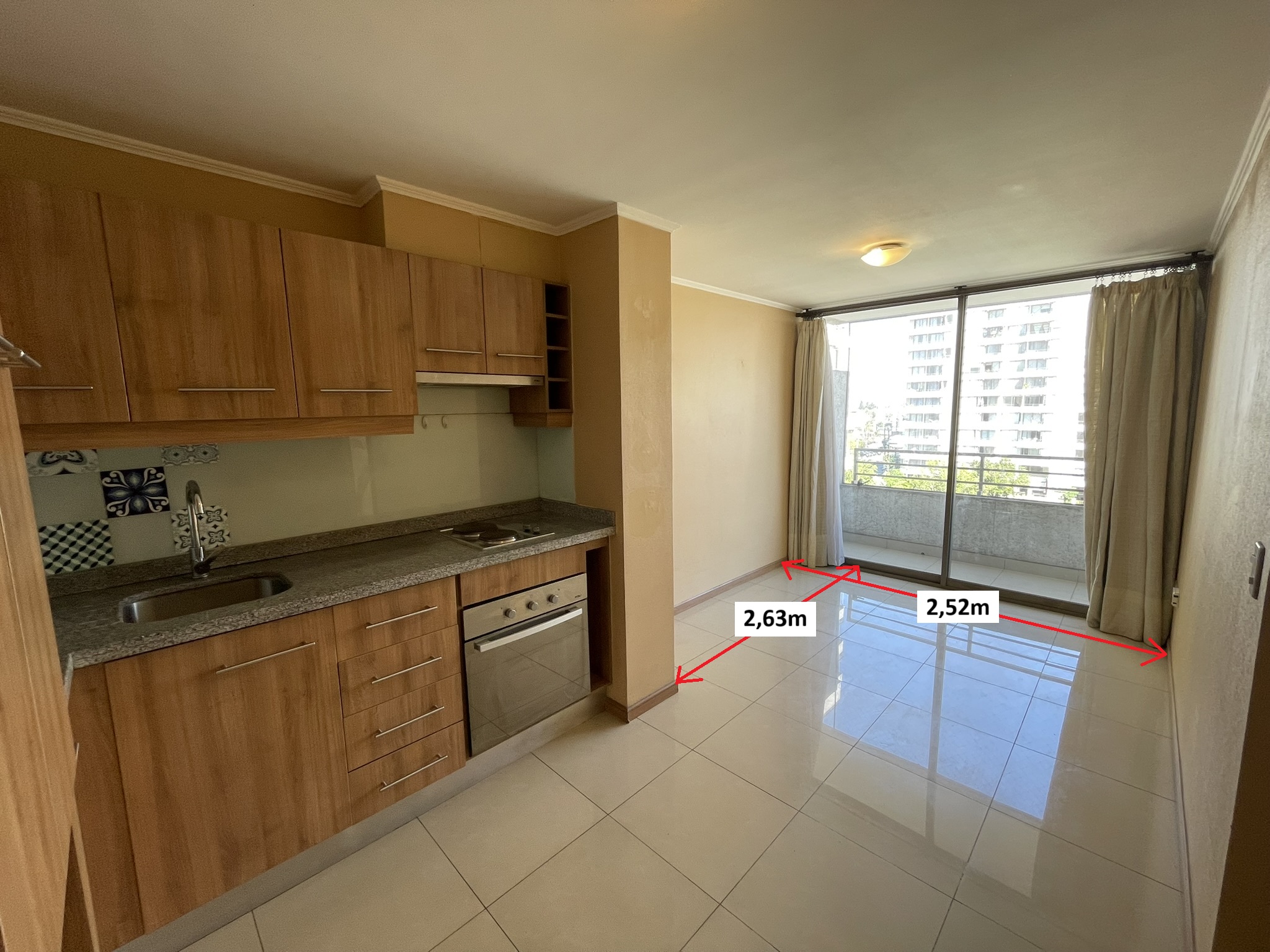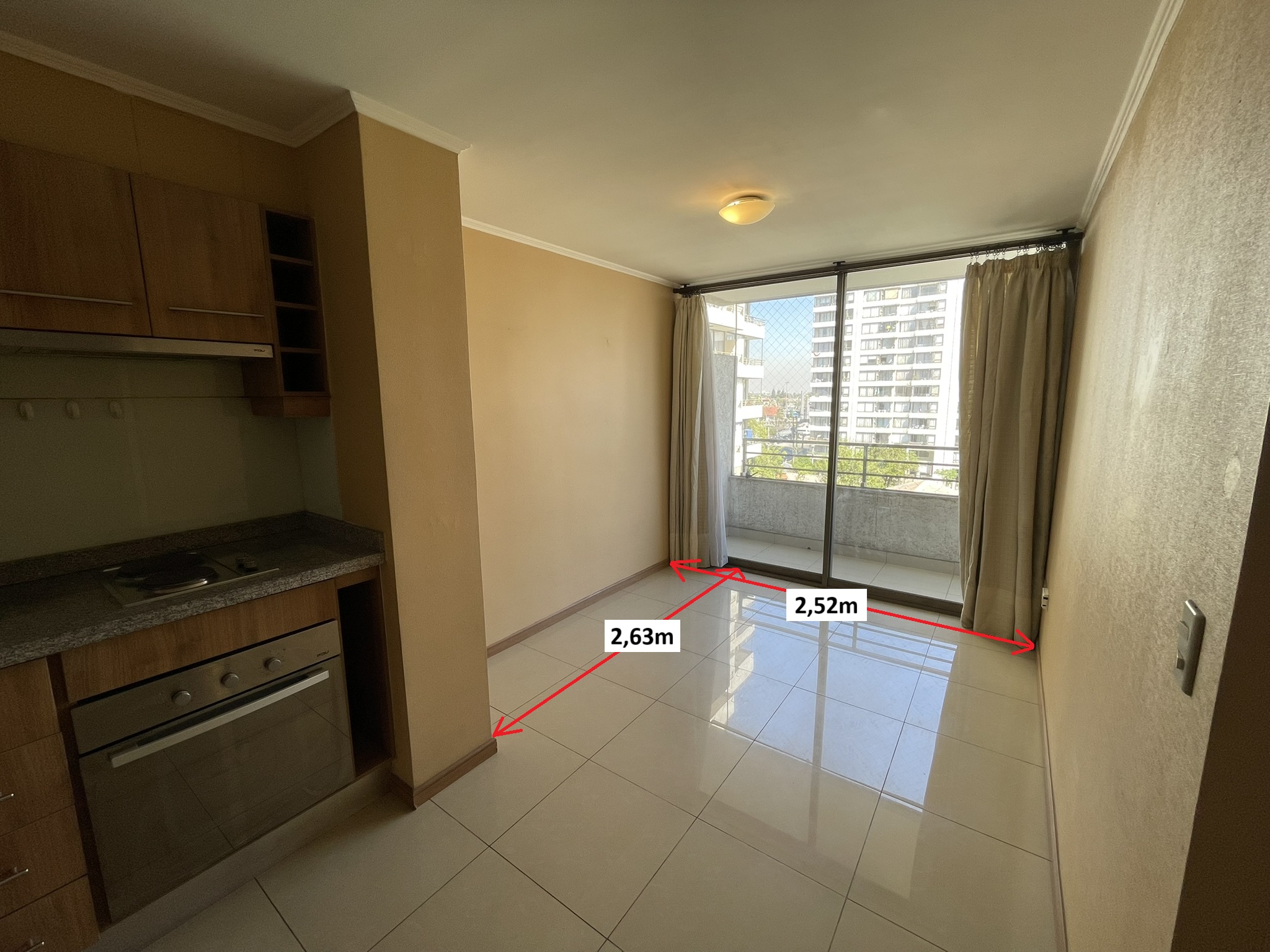 Living y comedor juntos, cocina americana amoblada y equipada con encimera, horno y campana eléctrica. Dormitorio con closet, un baño con receptáculo y balcón de 4,54m2.