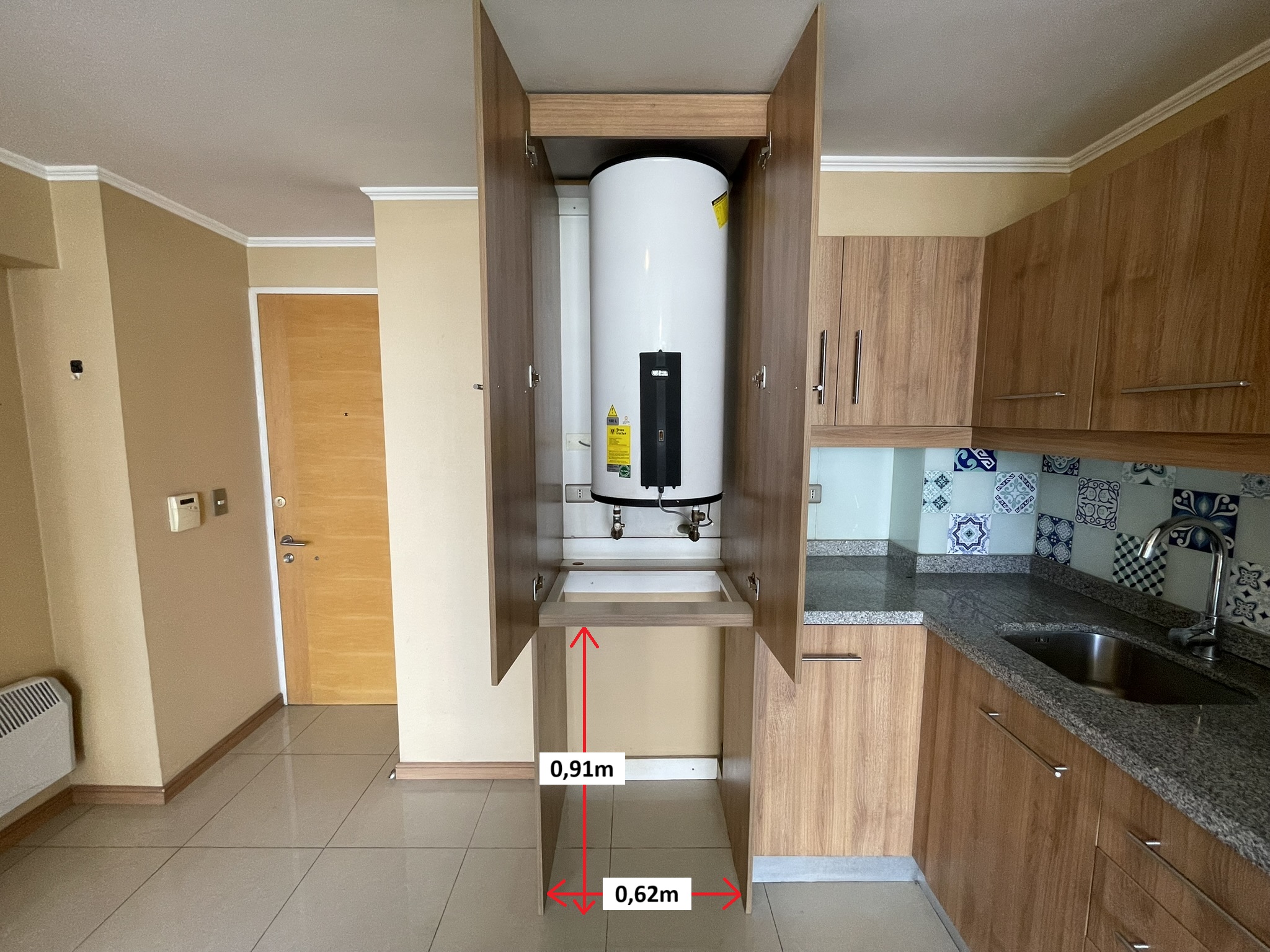 Cuenta con instalación para lavadora dentro de la cocina (solo para lavadora de apertura frontal), el espacio es de ancho: 0,62m – alto: 0,91m. Sistema de agua caliente mediante termo eléctrico individual ubicado en la cocina. Propiedad cuenta además con calefactor eléctrico.